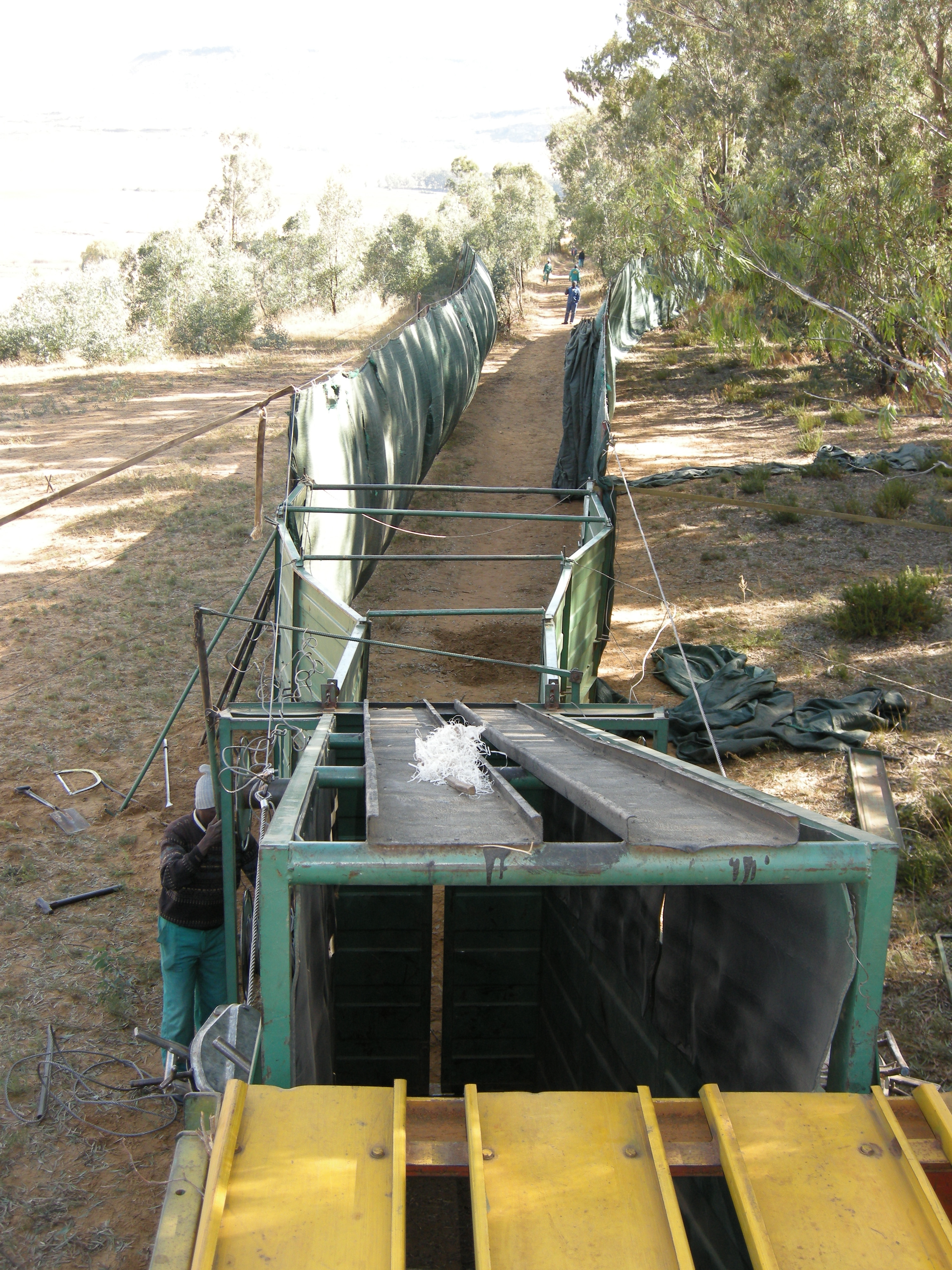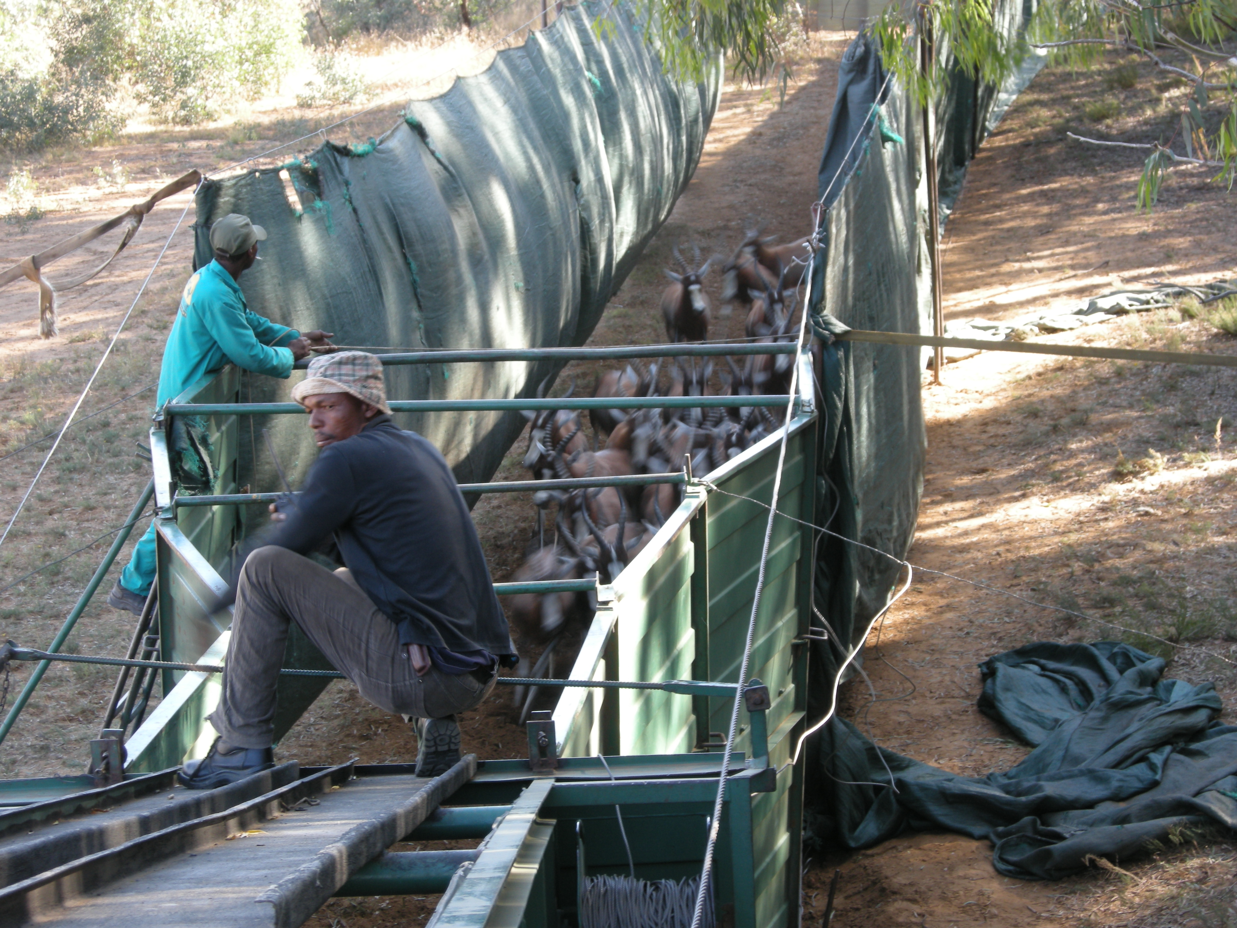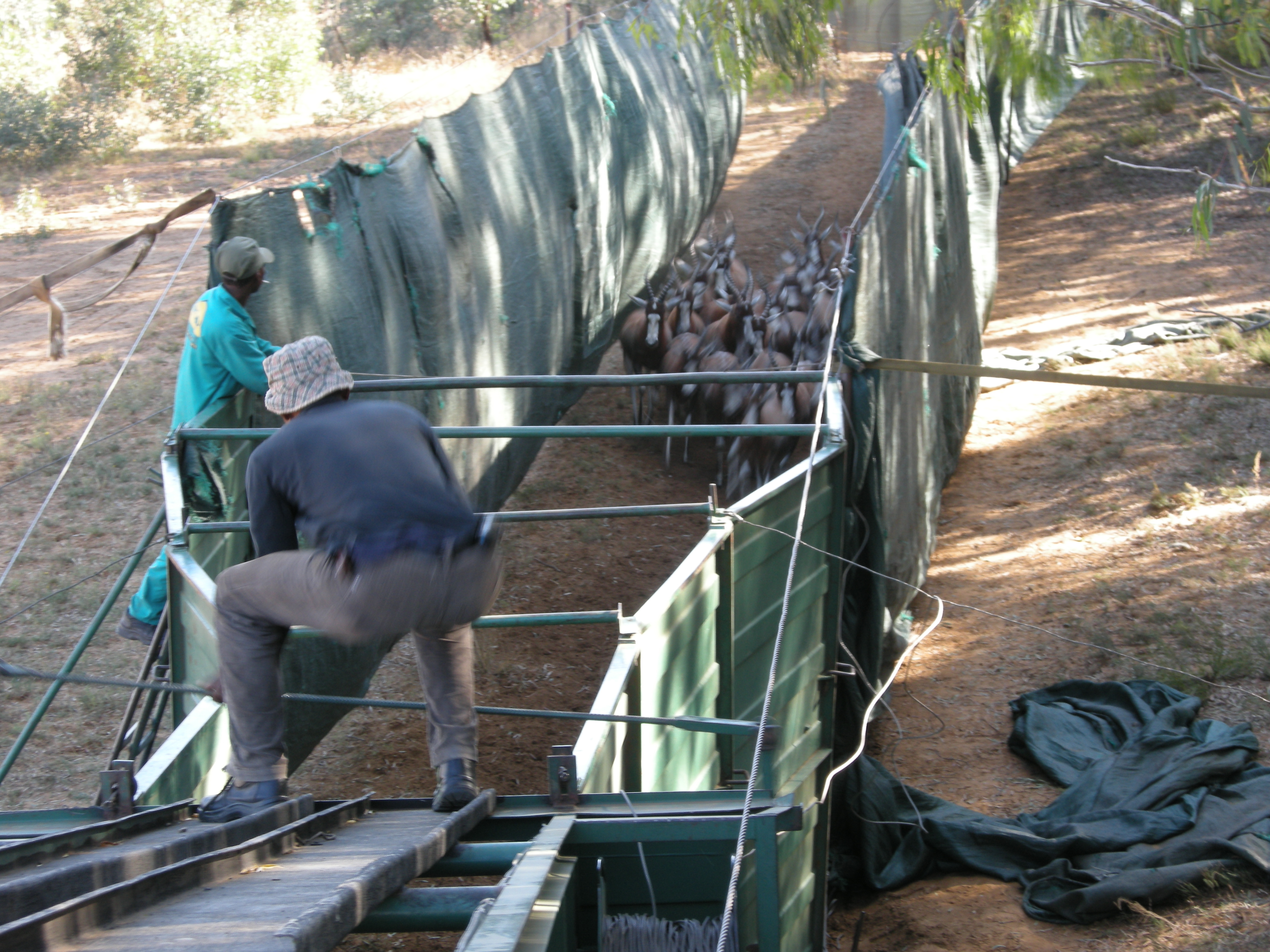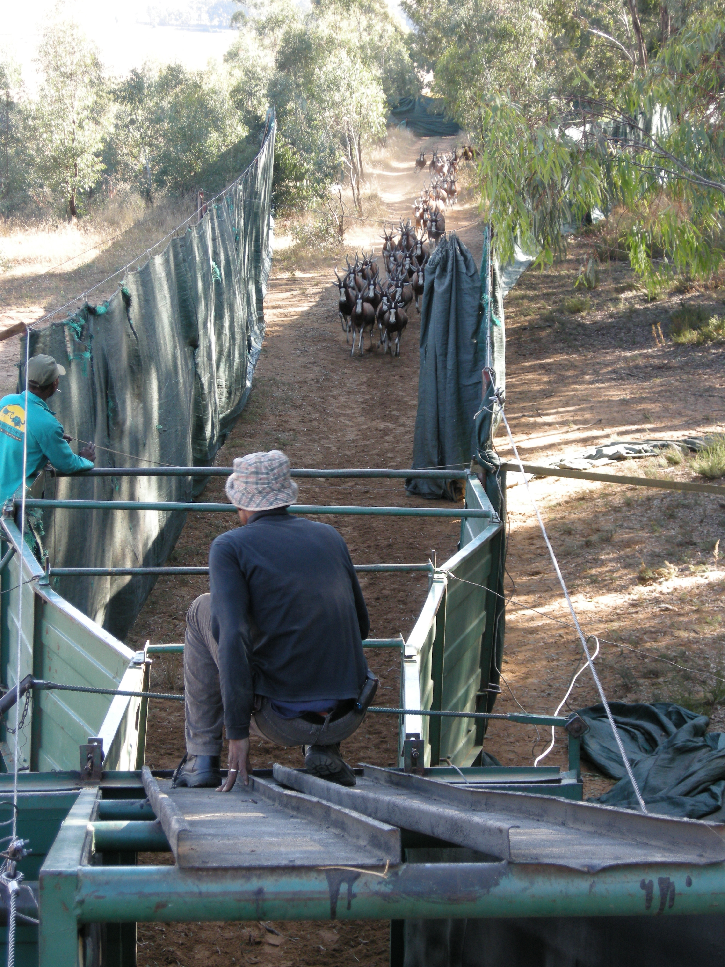 As we approached the area, we could see the large green plastic fences that create a “path” for the game to enter into and follow through to the trucks.