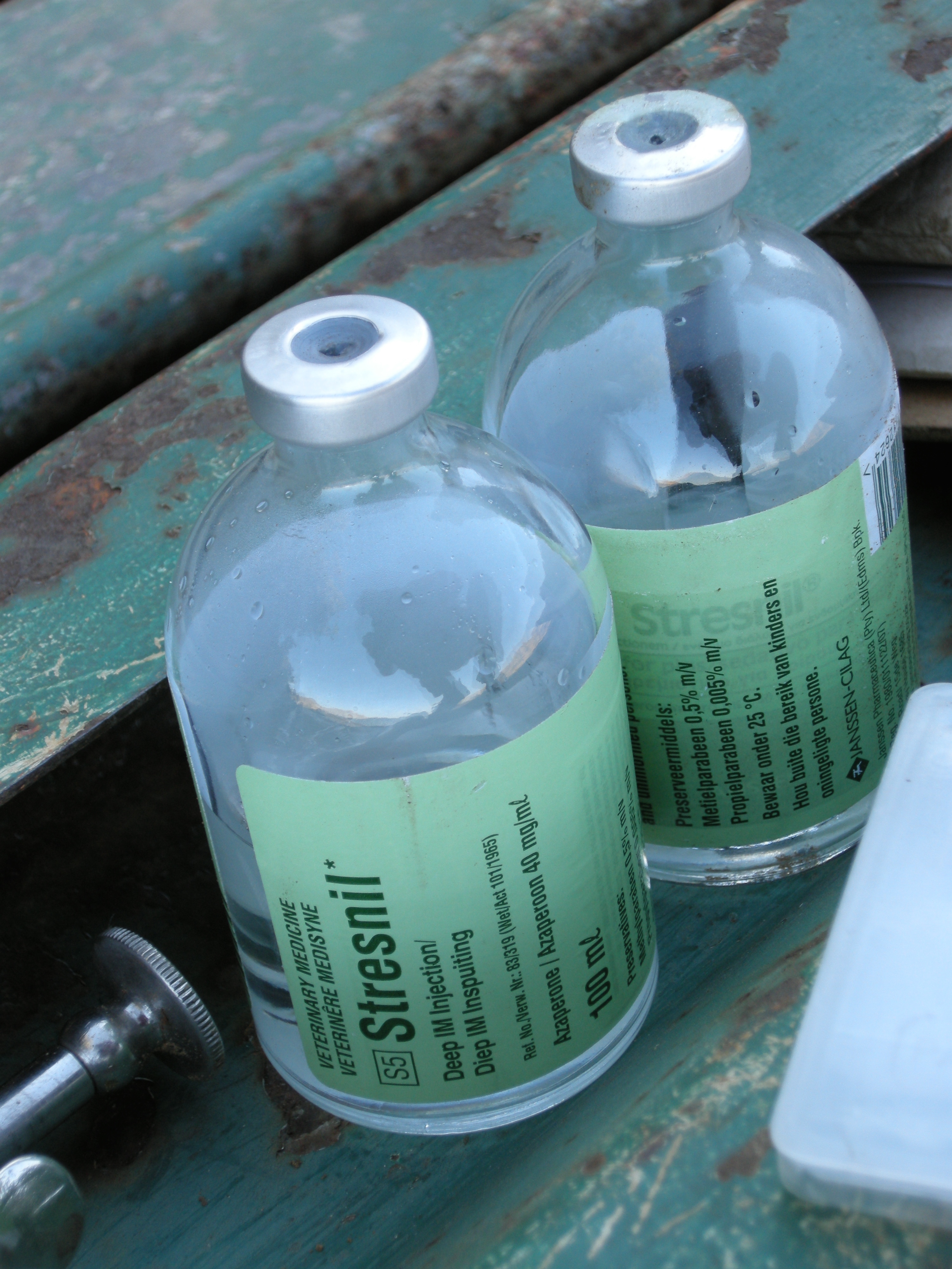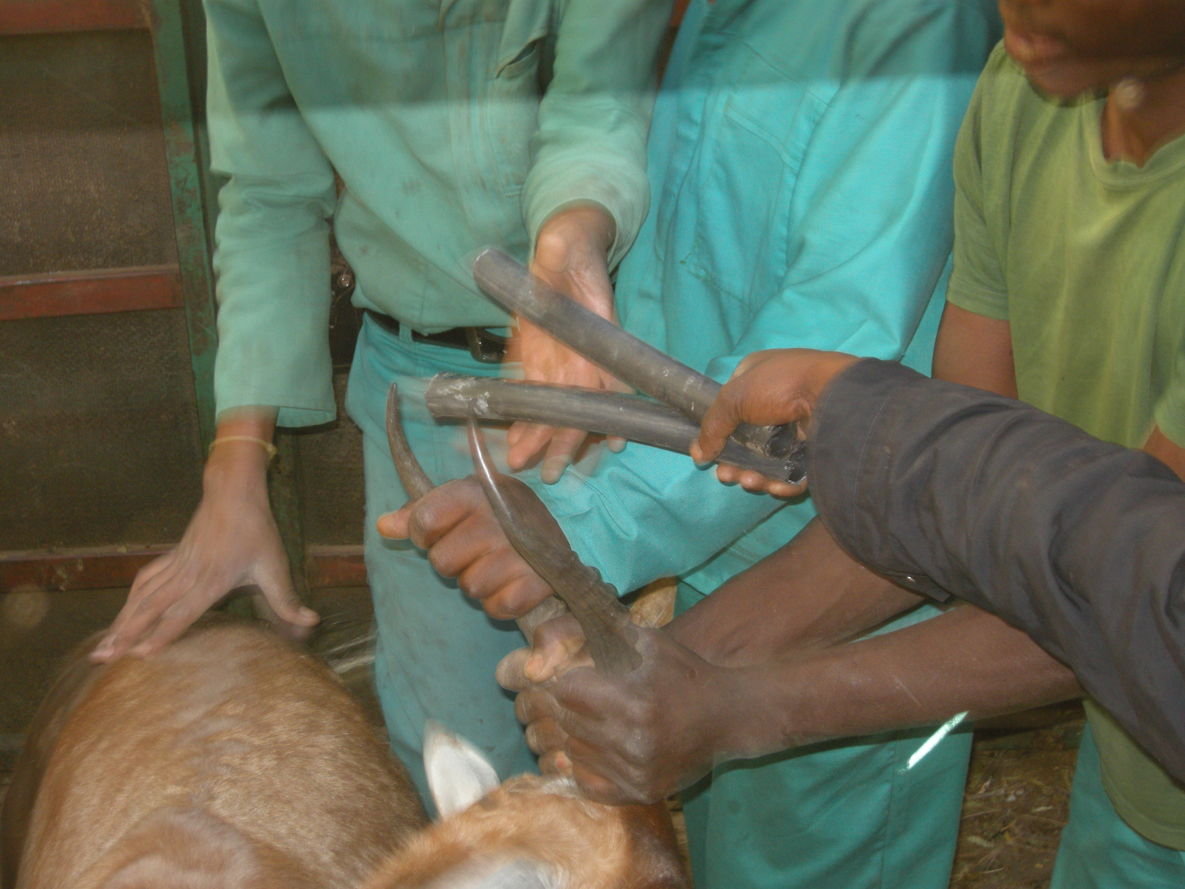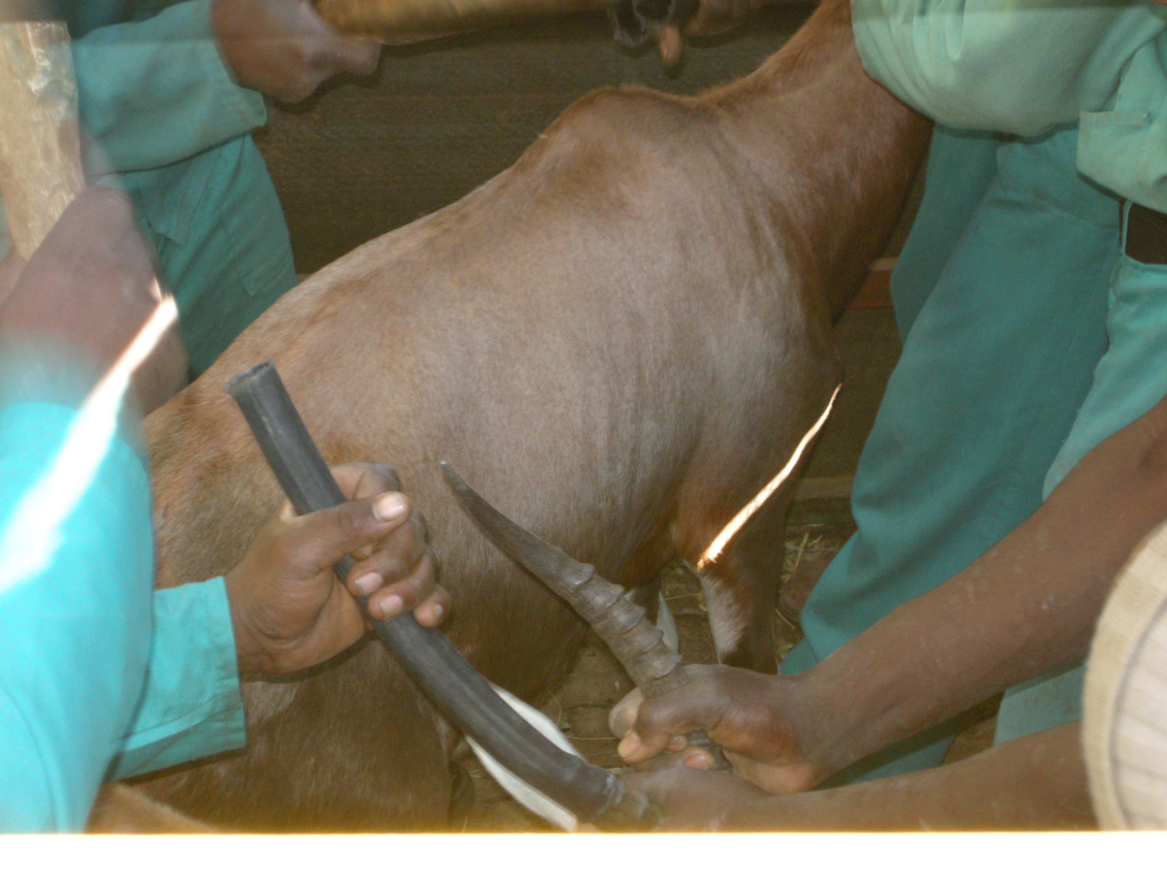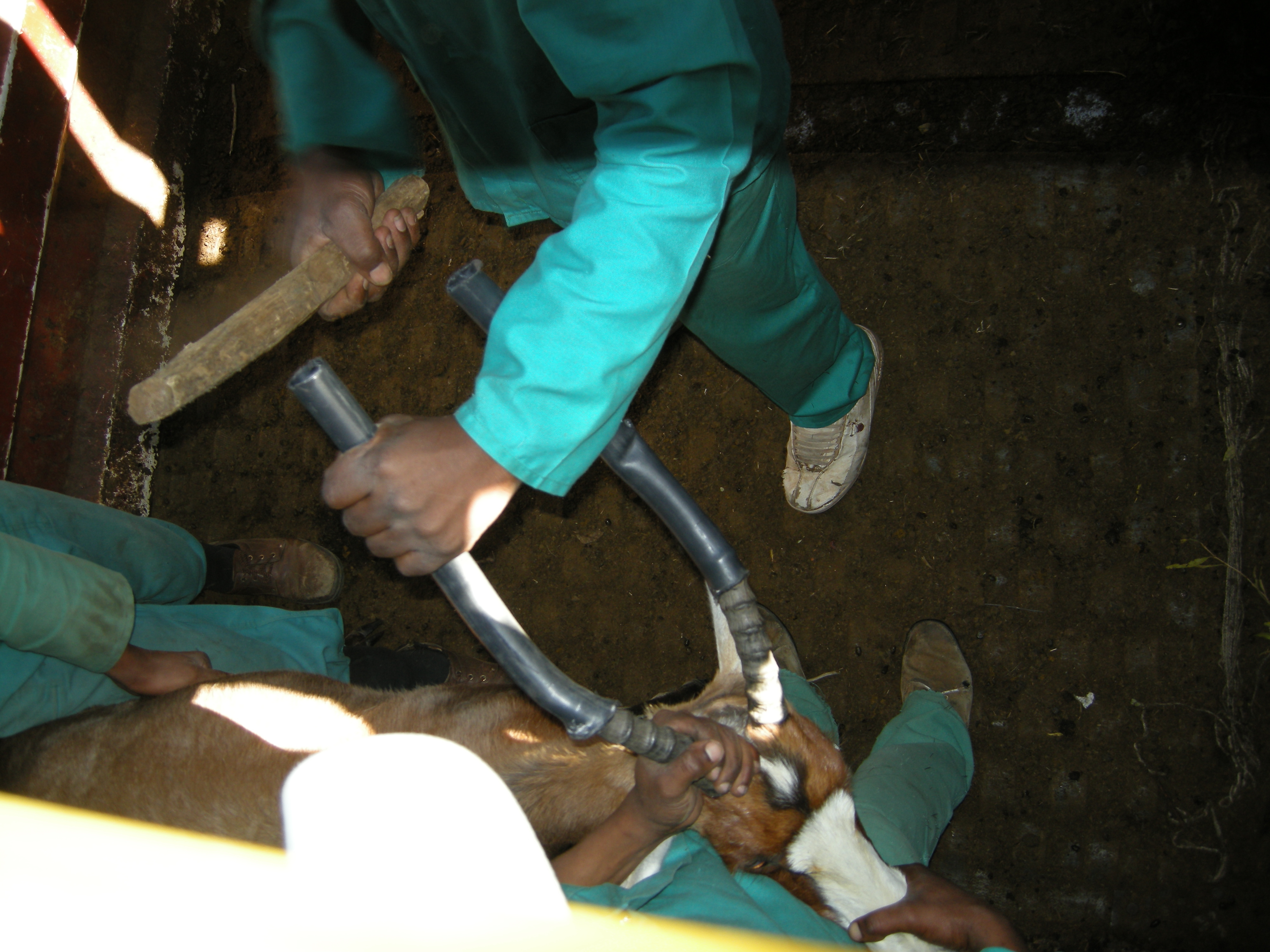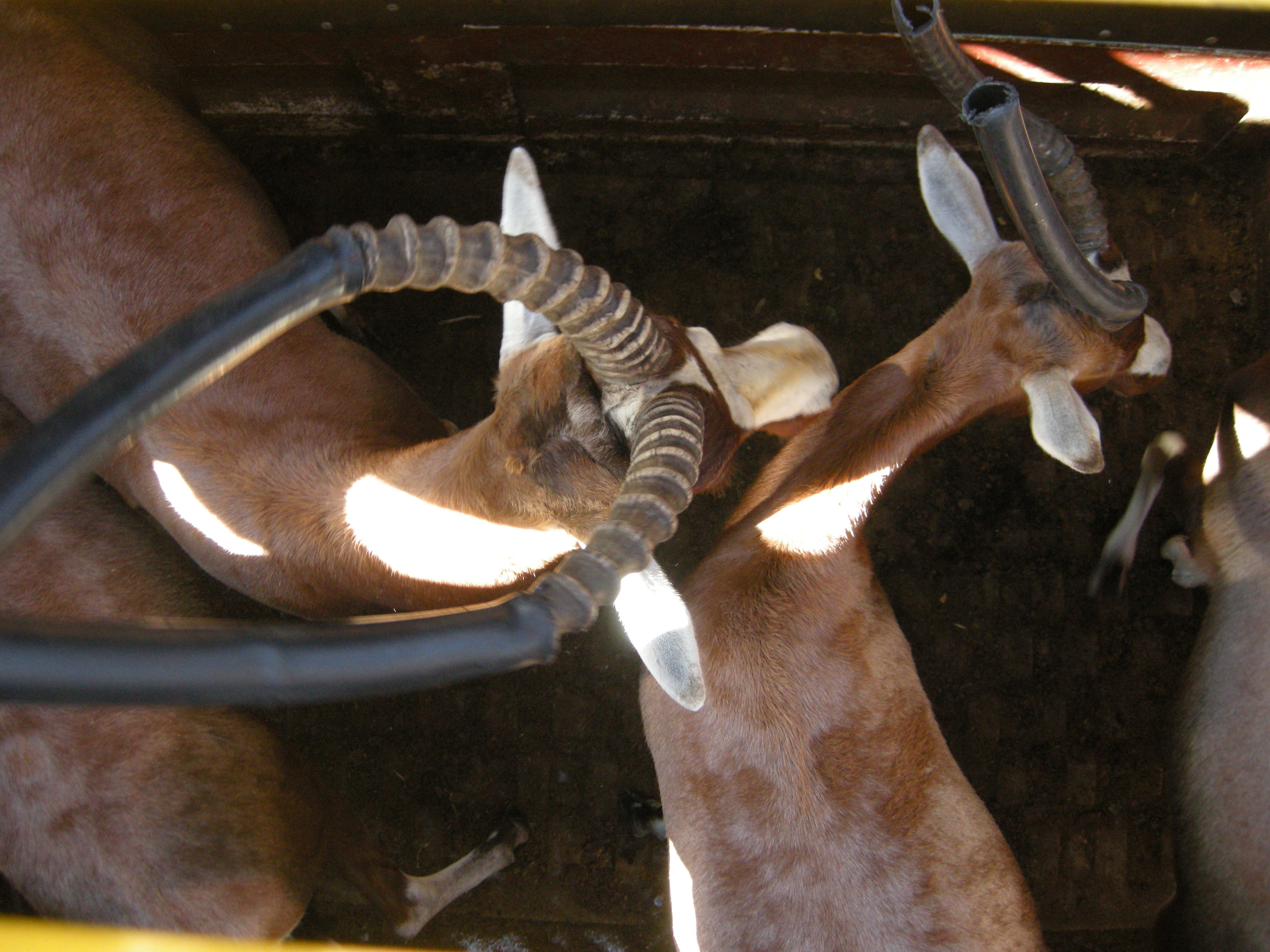 The men inside are soon busy pounding the rubber pipes onto the horns as fast as they can. With all of this going on you can imagine that the blesbak are nervous, some frantic, others crazy and the containers are rocking!