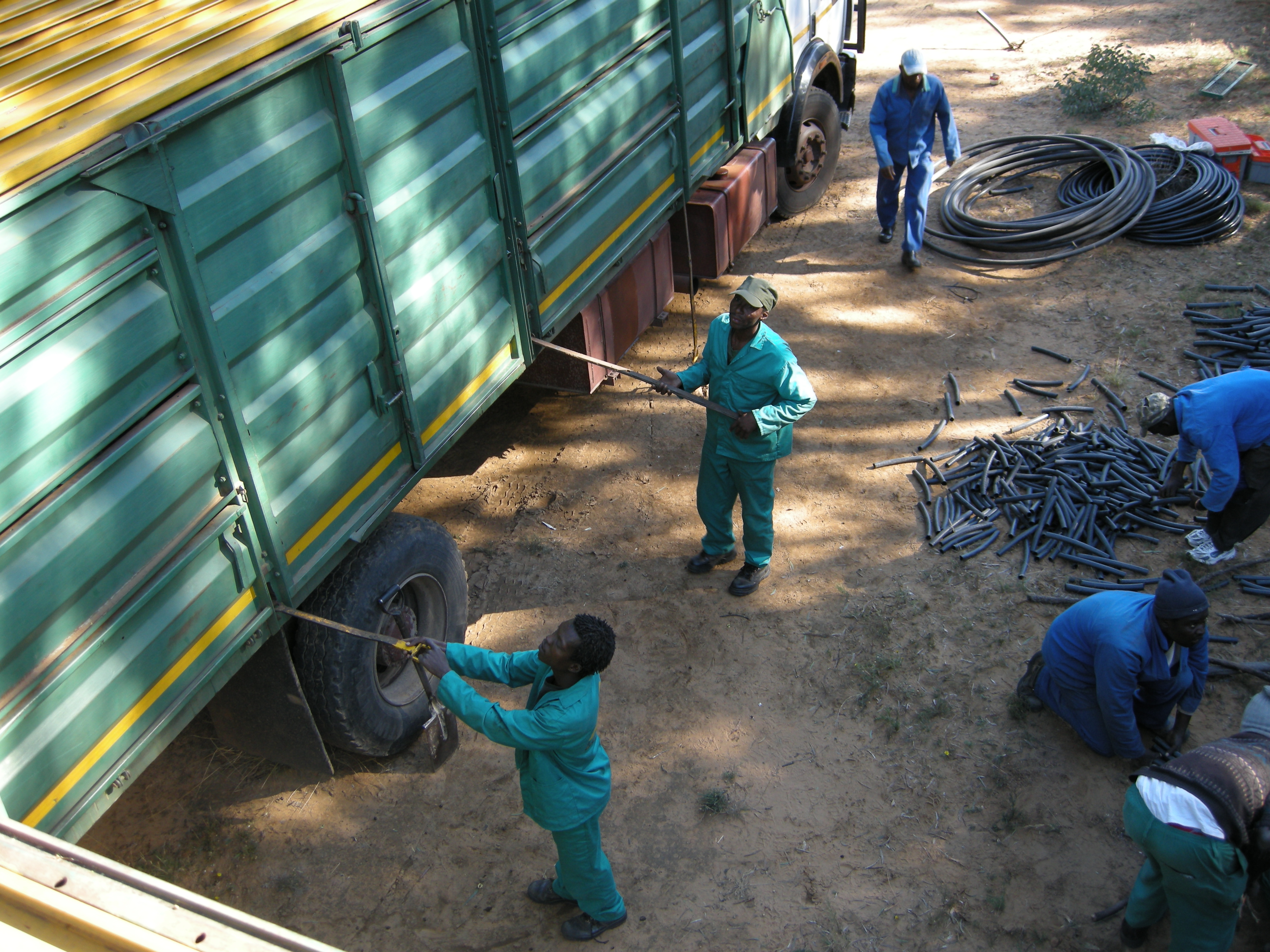 As soon as the animals are inside the men break into teams. One group warms the hoses, the second group jumps up to the roof of the container and the third groups goes inside with the animals. Everything is well orchestrated.