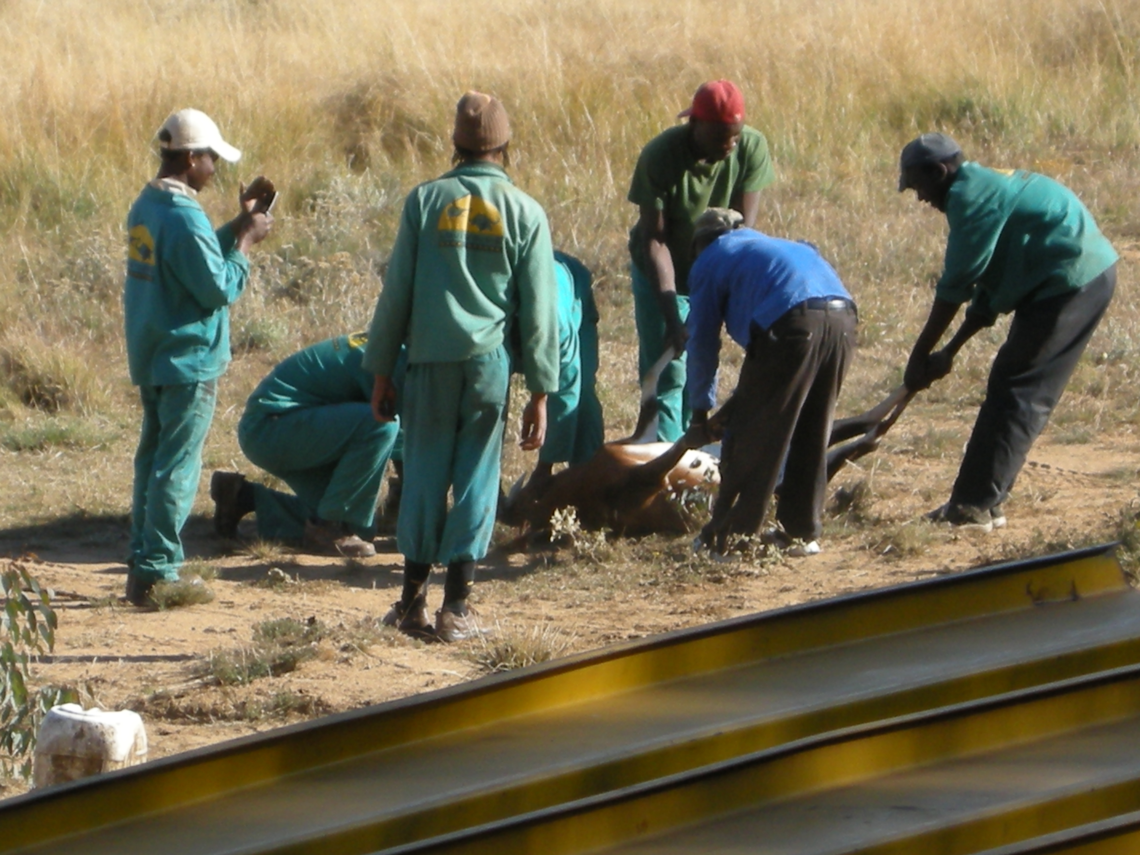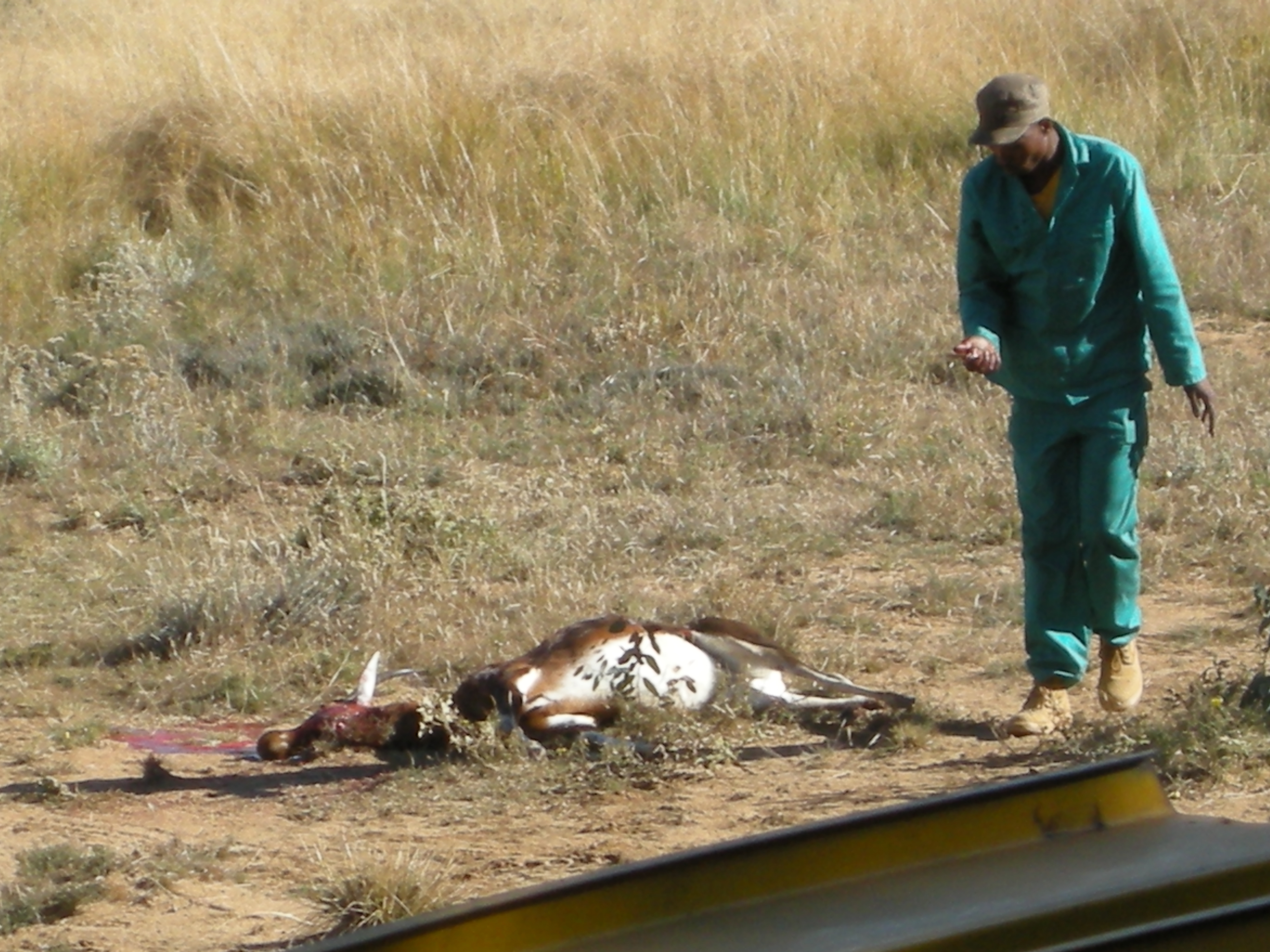 Another time, as a group of blesbaks were running down the tarp tunnel, one of them escaped through a section of the tarp. The men chased it down and re-captured it, then tried to get it back into the tunnel. During the struggle, the animal’s back leg broke in half. The men had to take it off to the side and slit it’s throat.