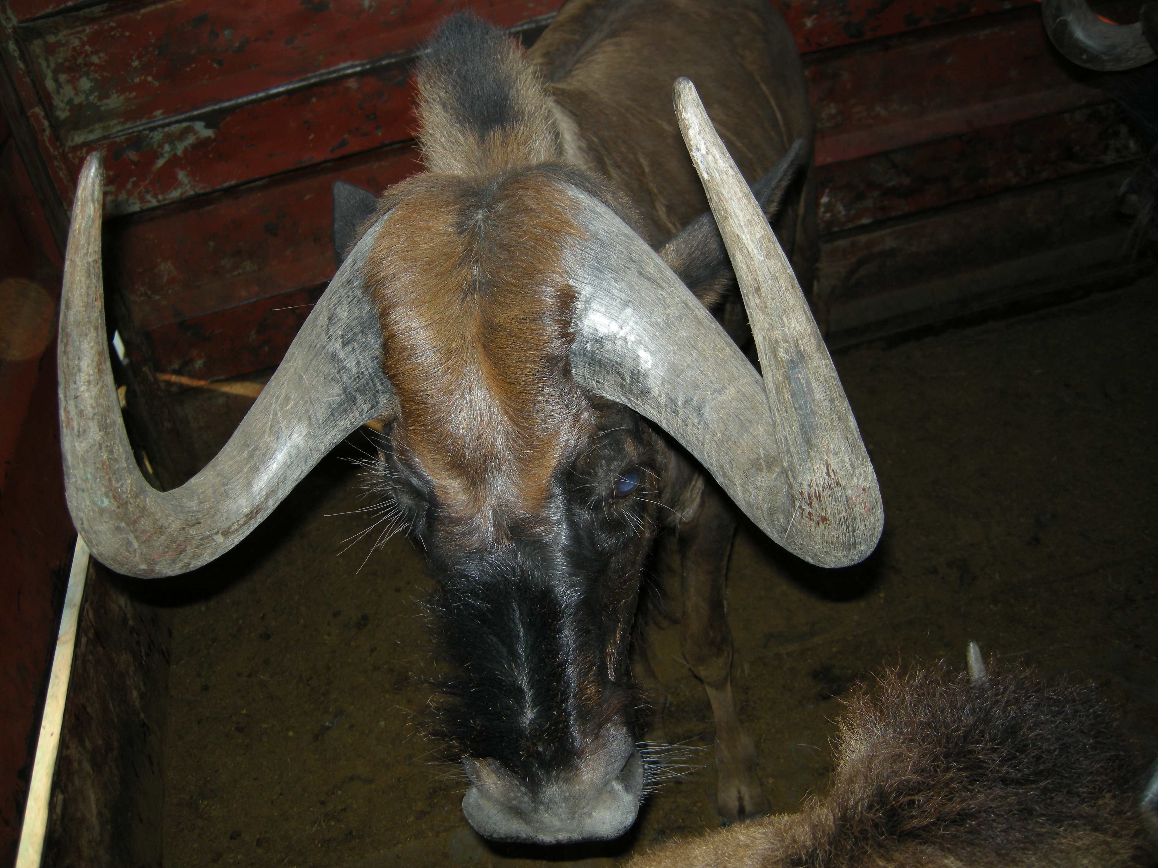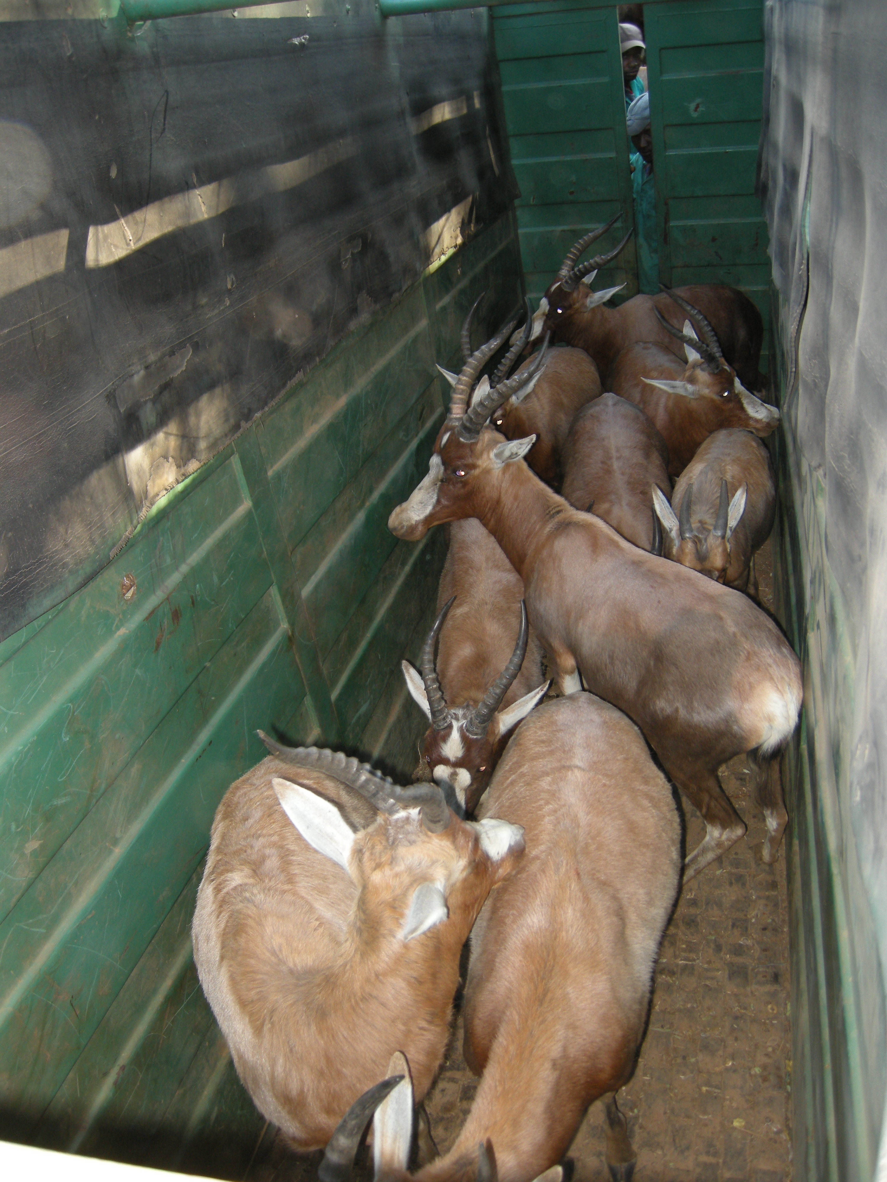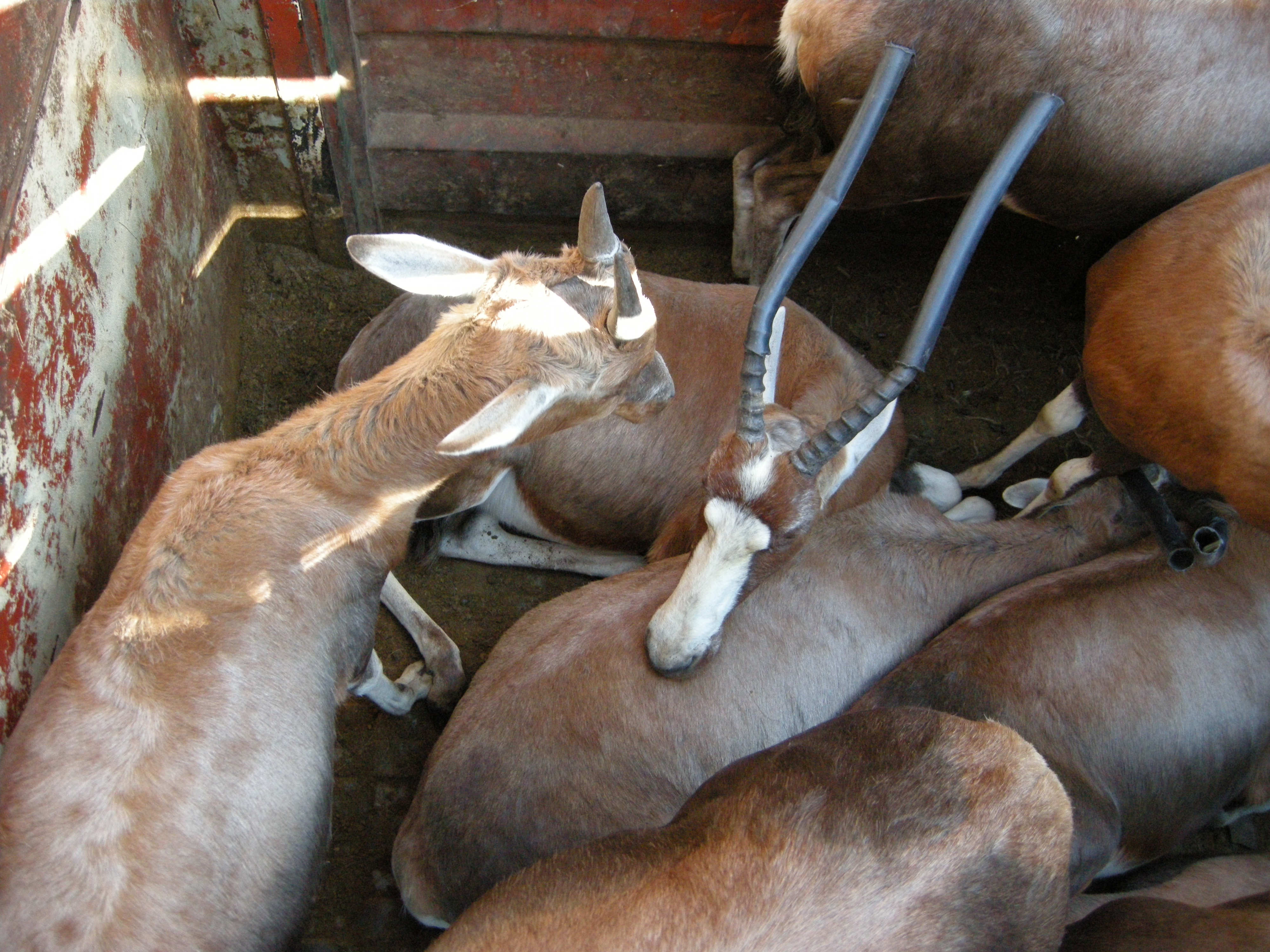 The next big group came through – I threw off my backpack – put the camera around my neck and followed Shelton through the first door. We went through two sections before coming to the one that held the last group of blesbak – about 12 animals. There were two other guys inside the container with us to make sure I didn’t get trampled 🙂 It took a moment to realize how hot it was inside. I put my hand on one of the animals and there was a tremendous amount of heat coming off of him.
