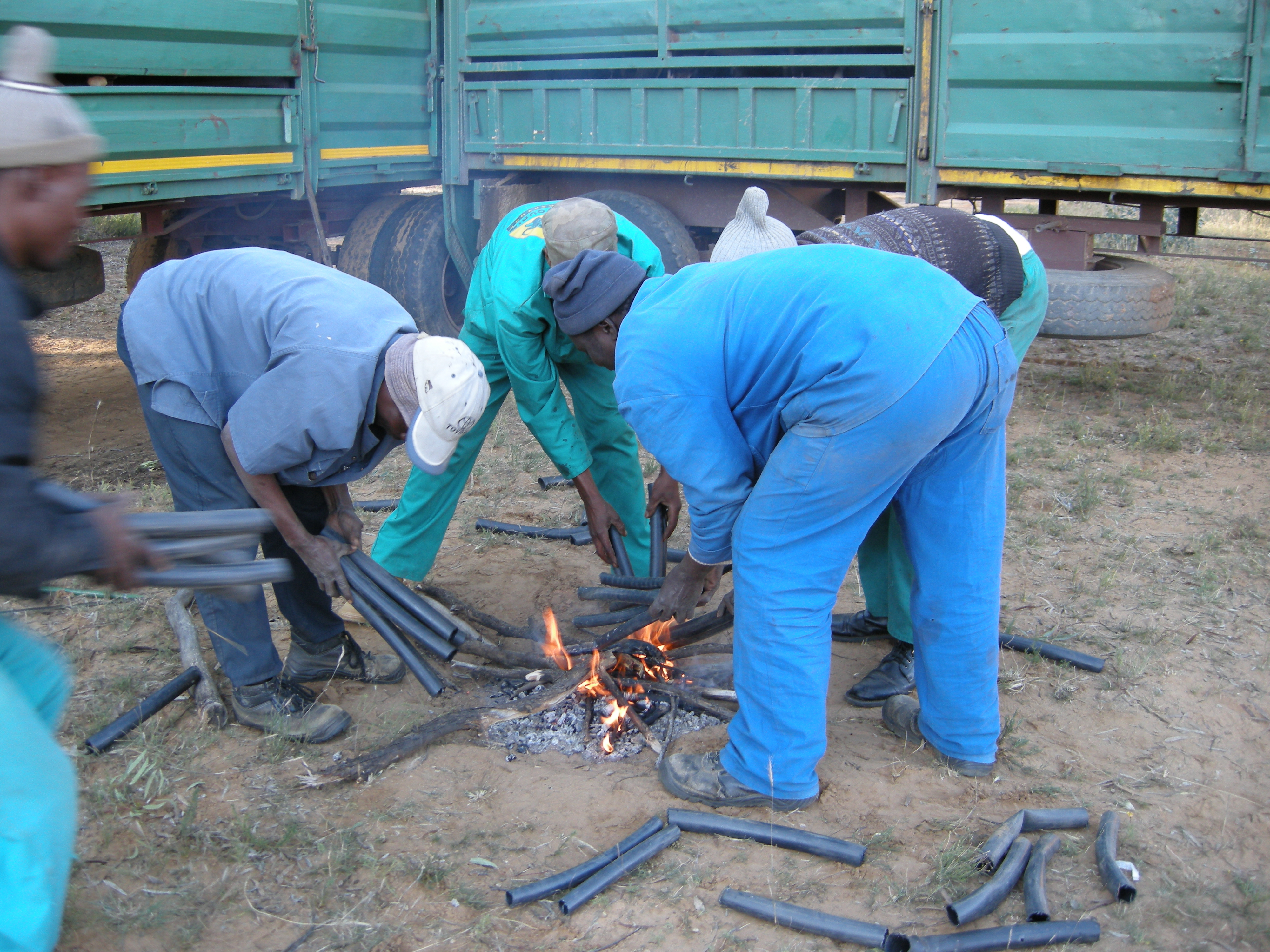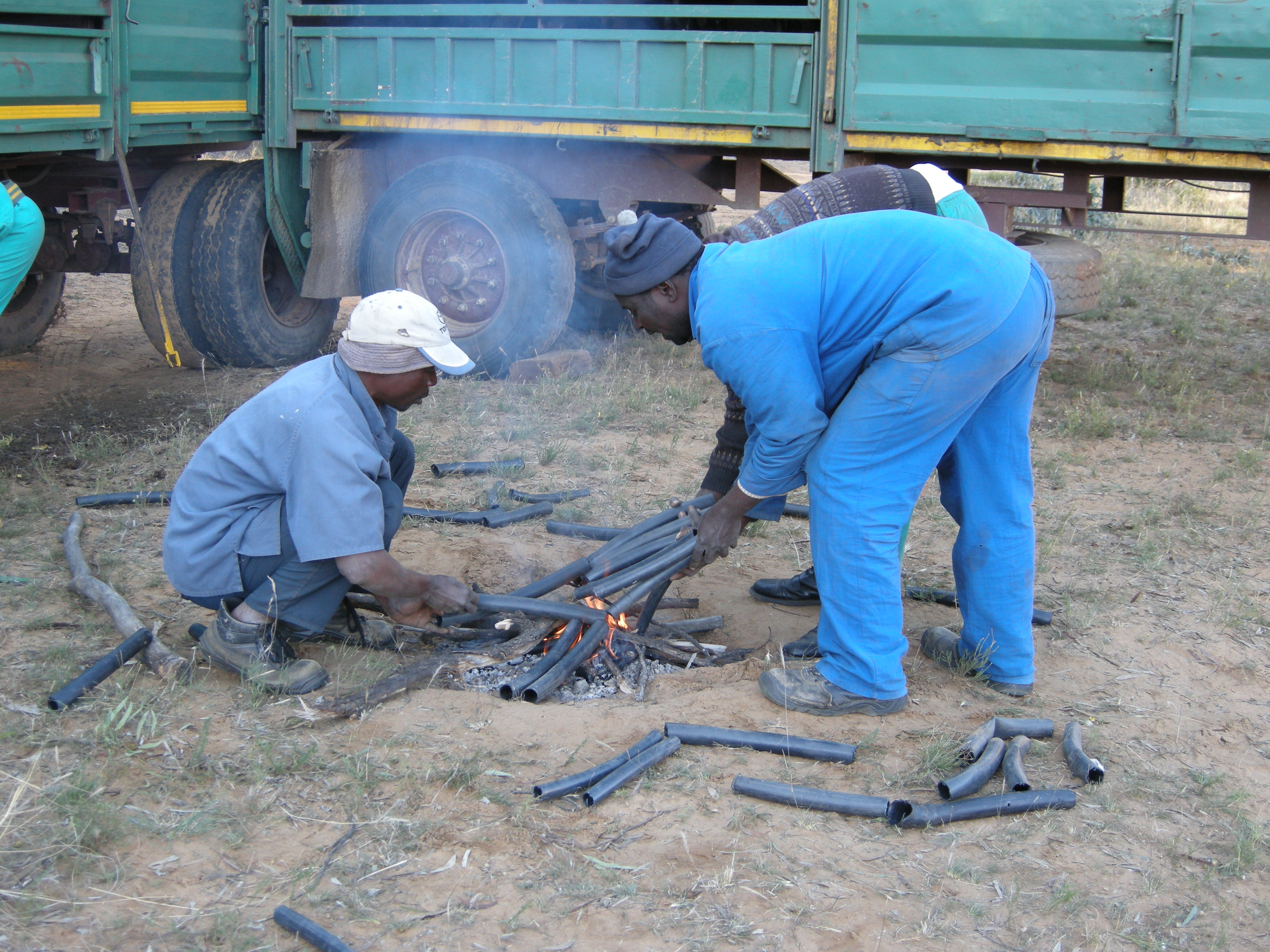 To make them flexible enough to fit over the horn, the rubber pipe must be warmed over the fire after which everything has to happen quickly – before the rubber cools.
