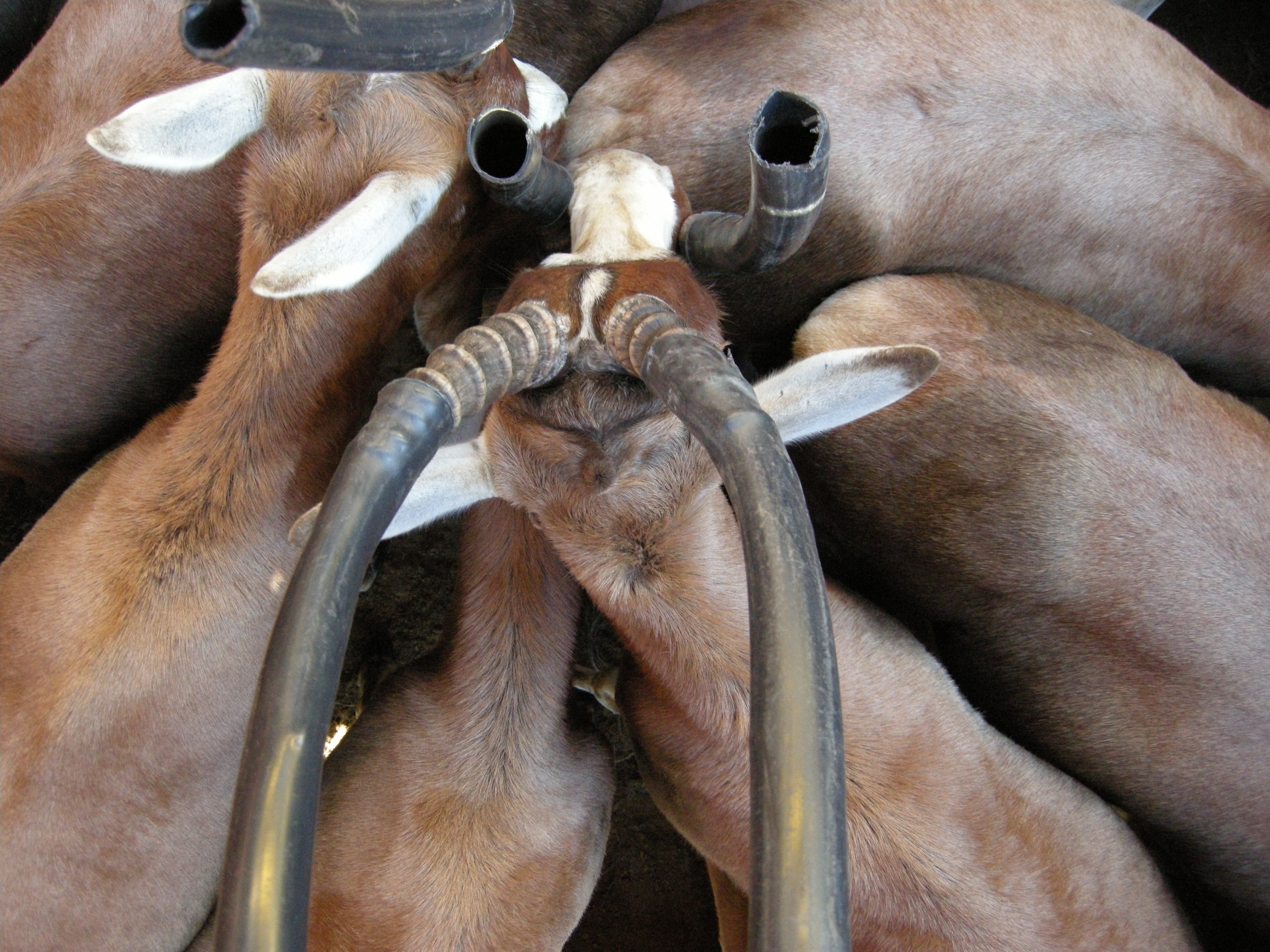 The hoses are slipped over the tips of the horns so they don’t gouge each other to death in the tight space. Smart.