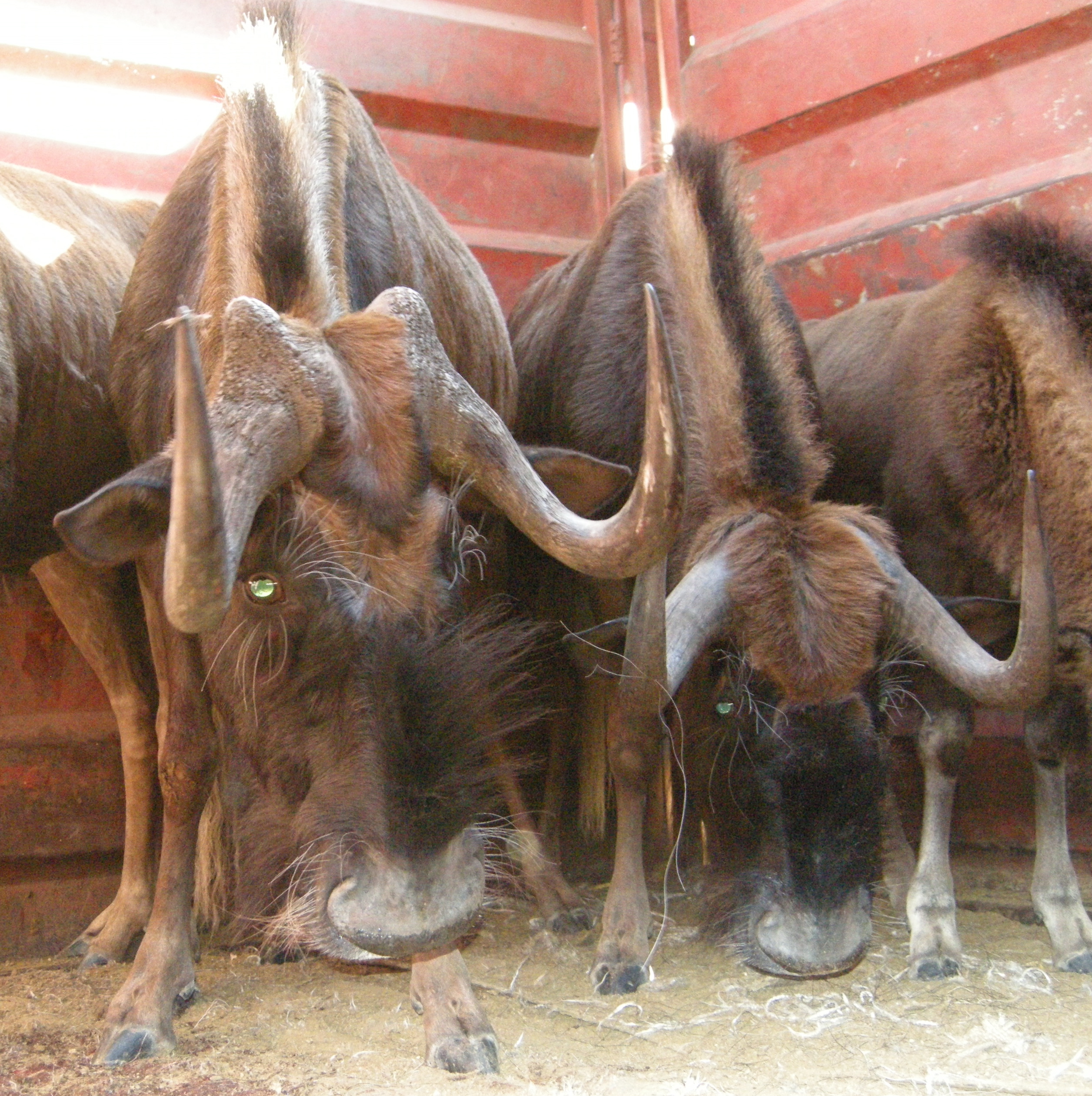 These shots below are taken from the ground looking into the trucks. They charged me the first time I looked into the container. I screamed and fell backwards — landing really hard on my butt and almost broke my camera! Damn wildebeest!