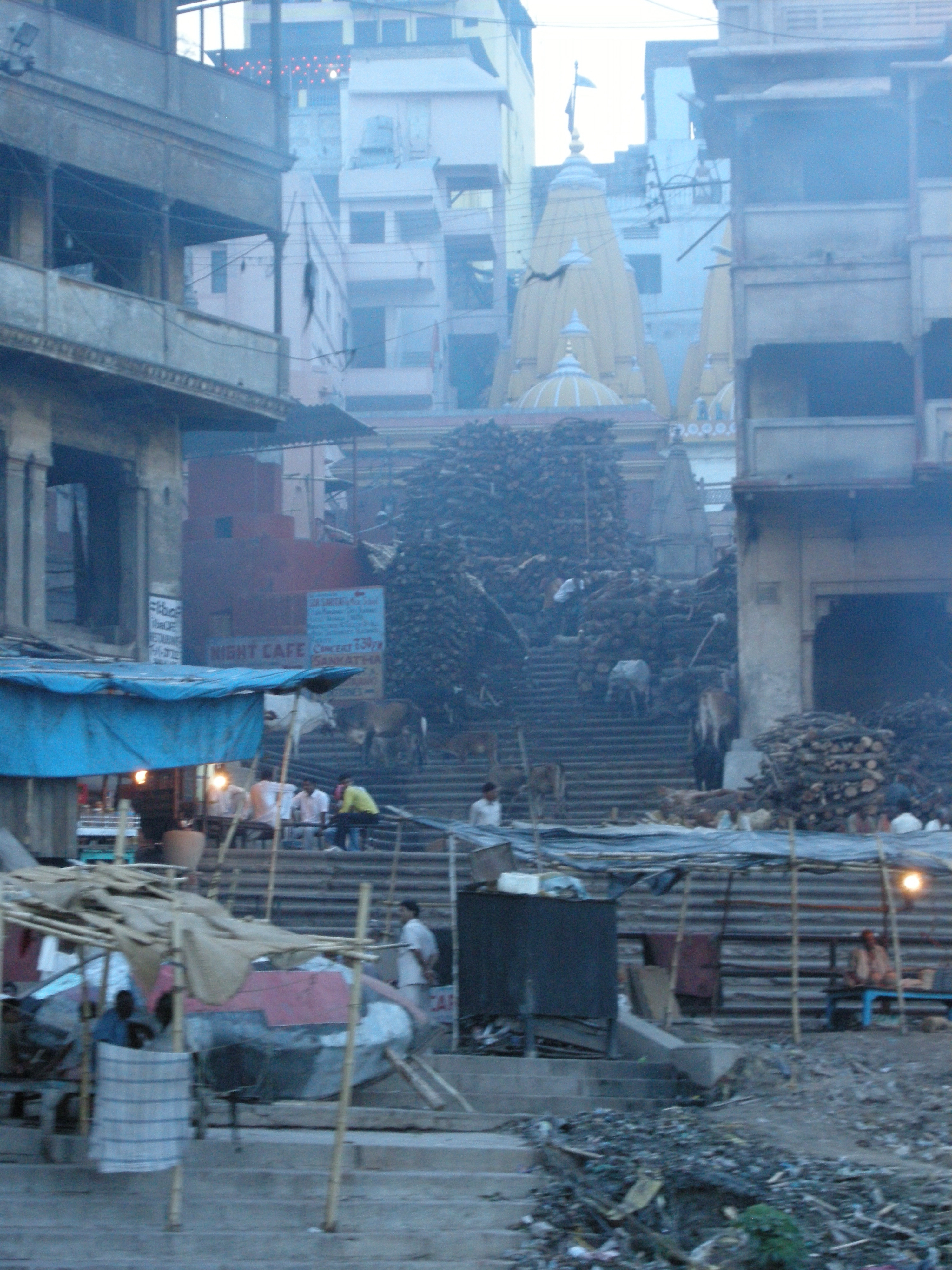 The other term that you need to know about with regards to Varanasi…is the Ghats. A ghat is a series of steps leading down to a source of water…in this case…the Ganges River. While there are very mundane purposes for these ghats…like washing, bathing and religious rites…there are also very specific ghats…like the cremation ghats. The cremation ghats are where bodies are burned 24/7 – the fires are never allowed to go out. By having the bodies cremated by the waterside, it allows the ashes to be washed away by the river. You will see stacks and stacks and stacks of wood around the crematorium ghats. Seriously…these fires never go out…sort of like the eternal flame.