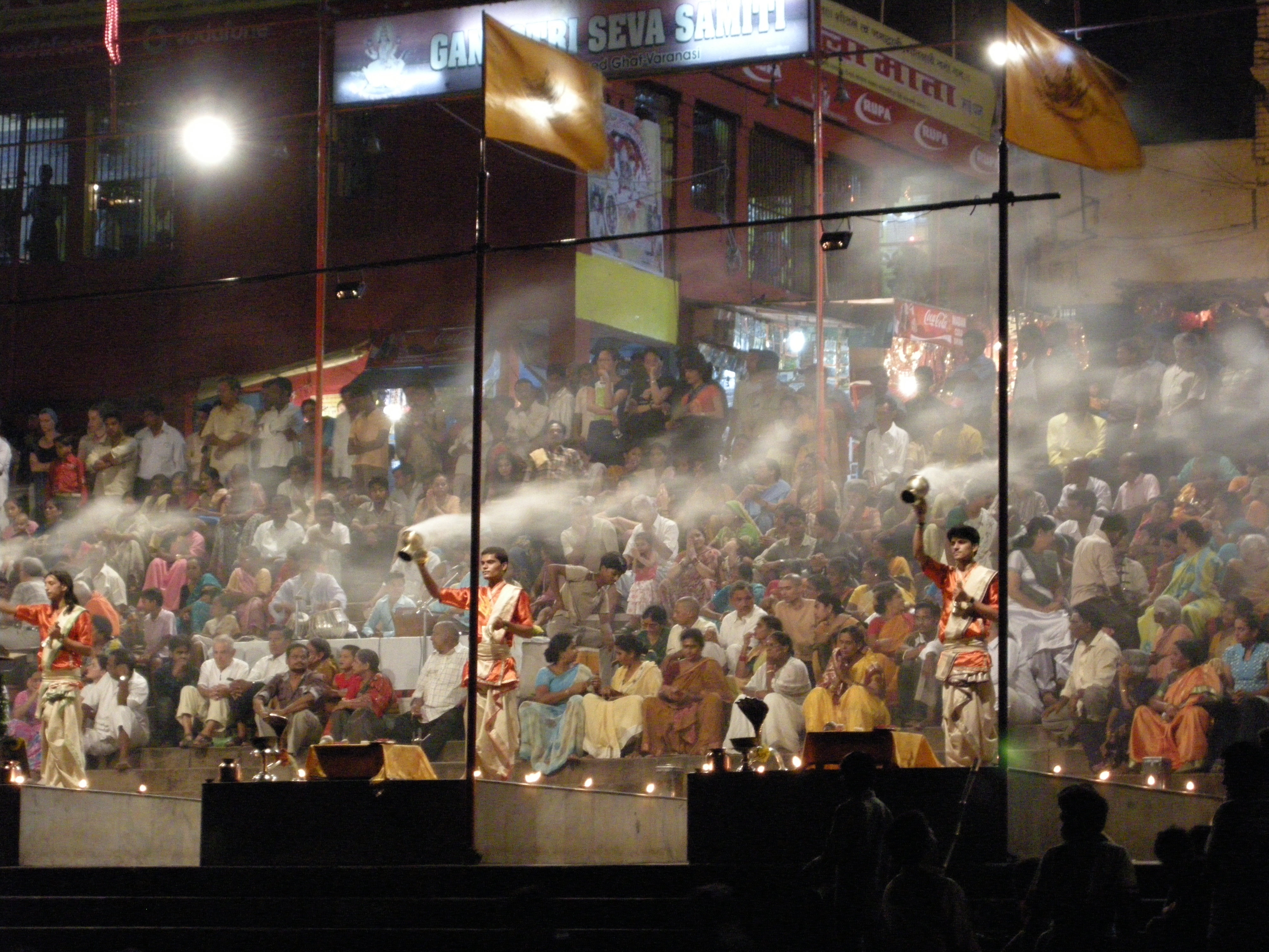 There are 5 priests on the stage performing their evening rituals for the crowd of pilgrims…